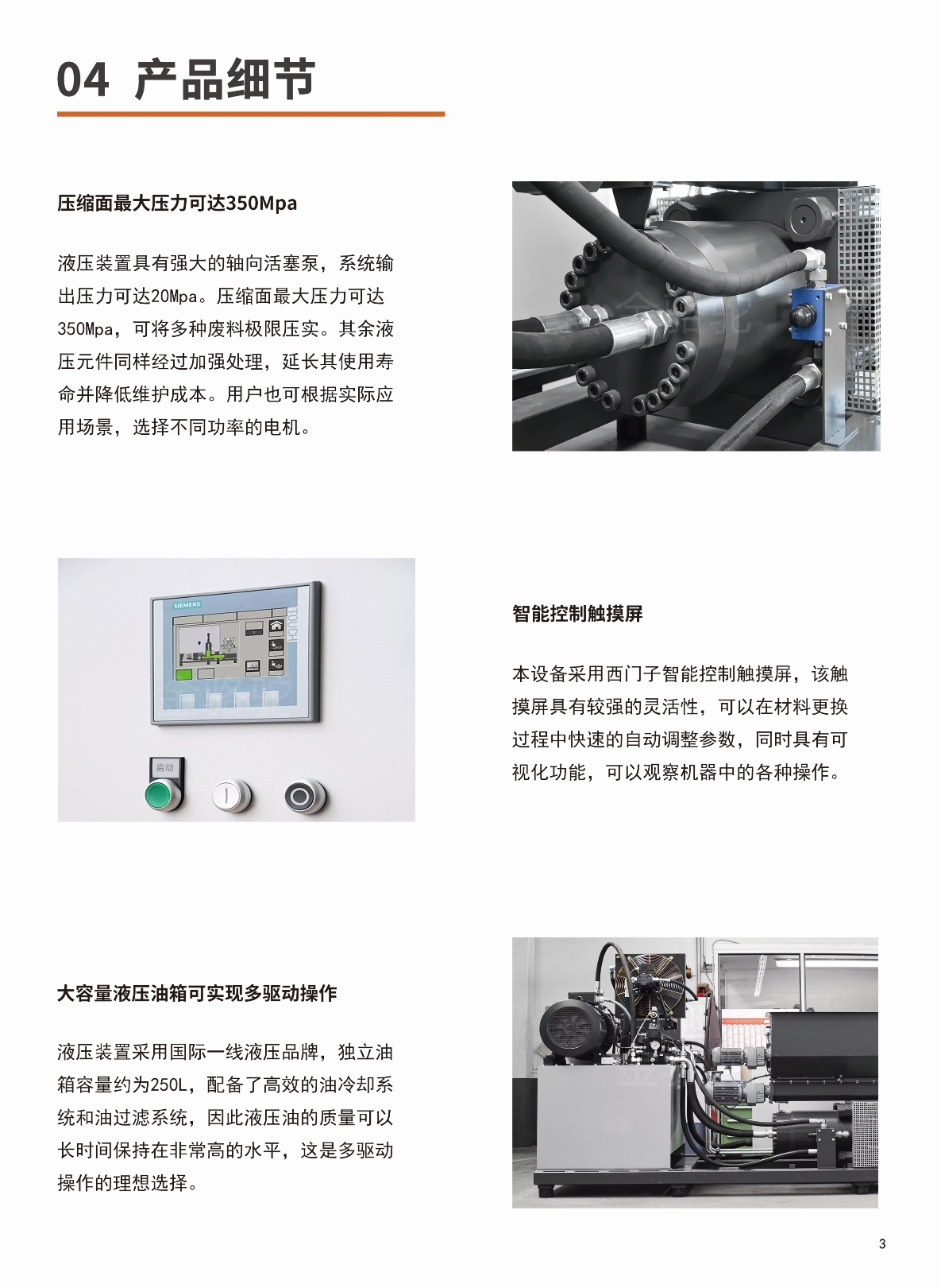設備液壓裝置強大軸向活塞泵輸出系統壓力可達20Mpa,最大壓縮面壓力可達500Mpa,通過(guò)矩陣技術(shù),機器可以更好的將松散的碎屑、灰塵或切碎的材料進(jìn)行極限壓實(shí);壓實(shí)不使用任何粘合劑,僅使用液壓壓力;該設備所產(chǎn)出的廢料塊尺寸統一、密度高,易于堆疊運輸。